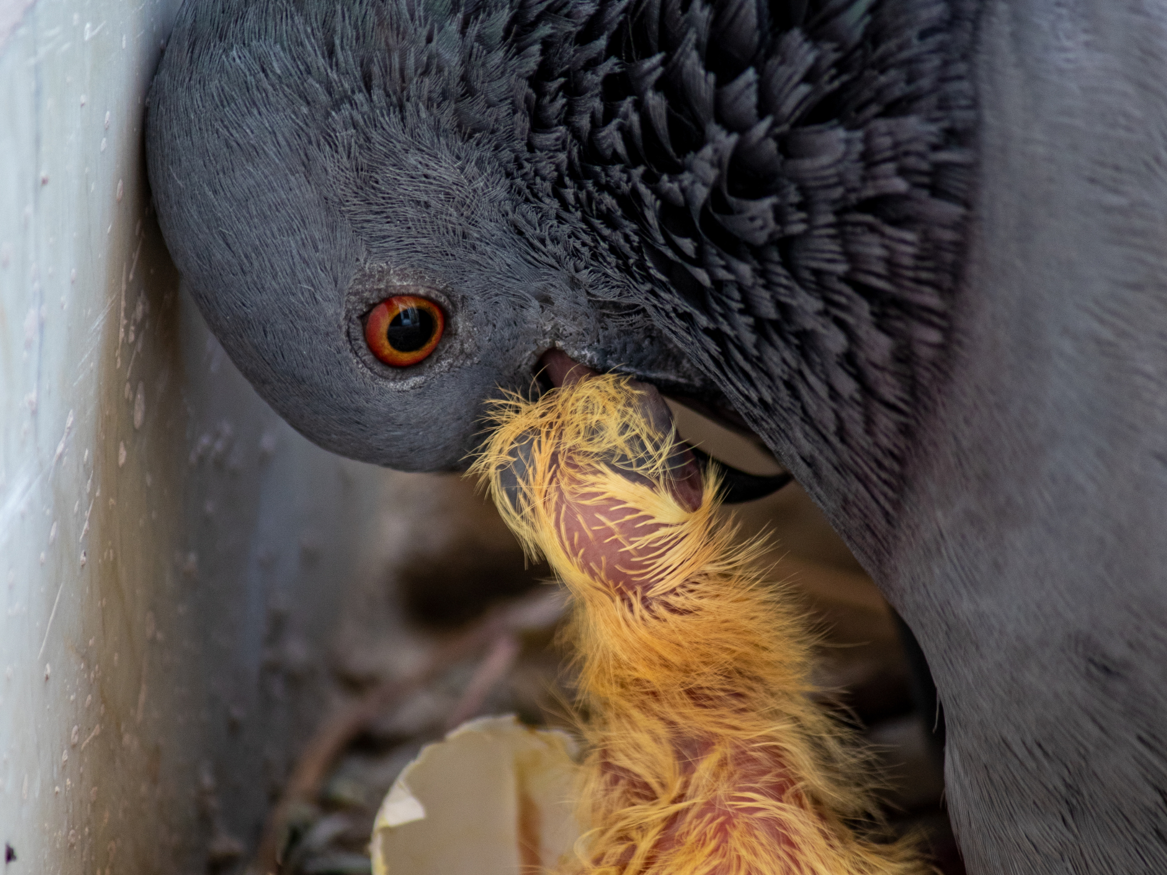 As the chicks grow, seeds are gradually introduced and mixed in with the crop milk until they’re ready to take in solid food on their own.
