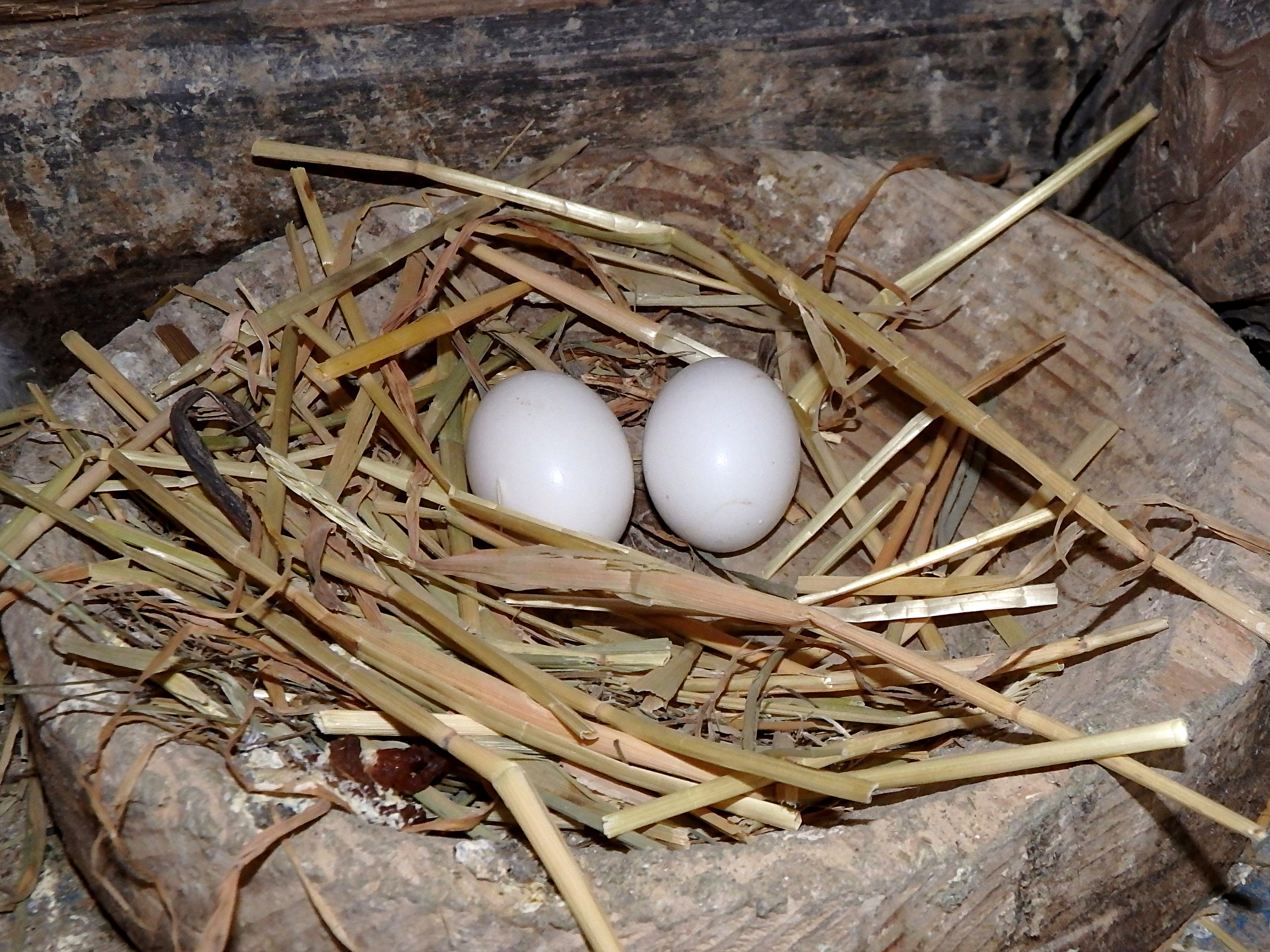 Almost always, it’s two. Not a large clutch. Just two eggs, laid about a day apart. The eggs are white and about half the size of a chicken egg.